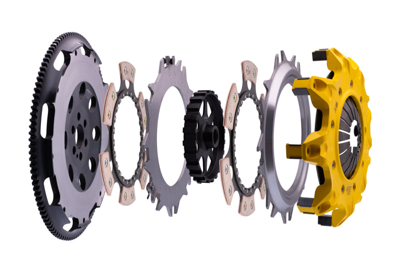 T1R-N06 Mod-Twin 225 HD Rigid Race Kit tackles aggressive launches and rapid shifting of high powered AWD’s by combining twice the ceramic friction surfaces with a no-nonsense solid Mono-Drive hub in a completely modular design. Each diaphragm spring endures an exclusive four-stage heat treating process providing a consistent light pedal feel. Puck-style Friction Plates with high quality ceramic friction materials deliver high friction coefficient, superior heat capacity, and long clutch life. These Friction Plates uniformly transfer torque to a Mono-Drive chrome-moly hub which is heat treated for strength and durability extending input shaft life with one continuous spline. The lightweight, rigid design allows for quicker shifts and trouble-free service. This kit includes a CNC-machined and dynamically balanced flywheel, pressure plate cover, diaphragm spring, face, puck-style ceramic friction plates, rigid Mono-Drive hub, floater, patented Monoloc Collar, release bearing, alignment tool and pilot bearing (if needed). Mod-Twin clutches are fully rebuildable and most components can be ordered separately.