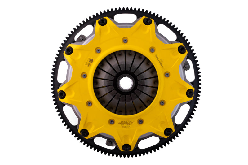 T2RS-N06 Mod-Twin 225 XT Sprung Race Kit performs aggressive launches and smoother shifting in high powered AWD’s by combining twice the ceramic friction surfaces with an ultra-durable Mono-Drive sprung hub assembly in a completely modular design. Each diaphragm spring endures an exclusive four-stage heat treating process providing a consistent light pedal feel. Puck-style Friction Plates with high quality ceramic friction materials deliver high friction coefficient, superior heat capacity, and long clutch life. These Friction Plates uniformly transfer torque to a Mono-Drive sprung hub assembly which extends input shaft life and reduces driveline shock from torsional vibration. This kit includes a CNC-machined and dynamically balanced flywheel, pressure plate cover, diaphragm spring, face, puck-style ceramic friction plates, sprung Mono-Drive hub assembly, floater, patented Monoloc Collar, release bearing, alignment tool and pilot bearing (if needed). Mod-Twin clutches are fully rebuildable and most components can be ordered separately.