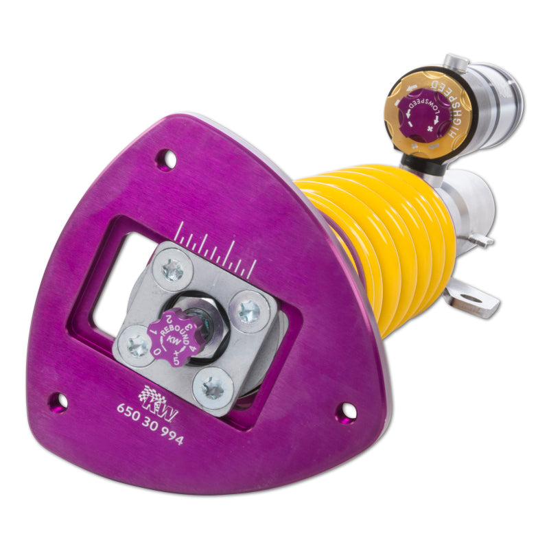 Using the Nordschleife as it's testing grounds and the 7-post rig, KW developed it's V4 Clubsport coilover kit. Wheel loads, vehicle weight and chassis reinforcements (increased body stiffness) can all be taken into consideration with Adjustment -capabilities of the V4 Clubsport. The KW Clubsport coilovers combine KW's high-end racing technology -with maintenance-free KW OEM quality components. Designed to provide you the ideal product to utilize the full potential of your sports car during autocross, track days, high performance drivers education (HPDE) courses, club racing, and is tested rigorously on race tracks such as the Nurburgring Nordschleife. Race teams rely on KW's racing expertise and experience for their vehicle setup. This same championship winning pedigree is mirrored in the development of each one of the KW Clubsport coilover systems. Similar to the KW Competition suspension used in international motorsports, the KW V4 Clubsport coilover kit allows fine tuning of the compression damping separately in the low-speed and high-speed range. The click adjustments of the TVCLH-A valve technology -ake for easy Adjustment -directly on the reservoir. You can modify the low-speed compression damping with 6 precise clicks with the purple low speed Adjustment -ial and directly beneath it the golden Adjustment -heel provides an additional 14 precise clicks of high speed compression adjustment. In addition, the TVR-A technology -provides 16 clicks to noticeably adjust the rebound damping independently of the compression damping. If you would like to adjust the KW V4 Clubsport coilover kit it can easily be adjusted for more comfort or to an alternative setup for a new race track. The KW V4 Clubsport benefits from the same motorsports technology -hat has proven its endurance with multiple overall wins at the ADAC Zurich 24h Nurburgring race.