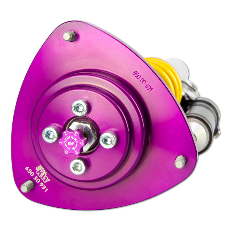 Using the Nordschleife as it's testing grounds and the 7-post rig, KW developed it's V4 Clubsport coilover kit. Wheel loads, vehicle weight and chassis reinforcements (increased body stiffness) can all be taken into consideration with Adjustment -capabilities of the V4 Clubsport. The KW Clubsport coilovers combine KW's high-end racing technology -with maintenance-free KW OEM quality components. Designed to provide you the ideal product to utilize the full potential of your sports car during autocross, track days, high performance drivers education (HPDE) courses, club racing, and is tested rigorously on race tracks such as the Nurburgring Nordschleife. Race teams rely on KW's racing expertise and experience for their vehicle setup. This same championship winning pedigree is mirrored in the development of each one of the KW Clubsport coilover systems. Similar to the KW Competition suspension used in international motorsports, the KW V4 Clubsport coilover kit allows fine tuning of the compression damping separately in the low-speed and high-speed range. The click adjustments of the TVCLH-A valve technology -ake for easy Adjustment -directly on the reservoir. You can modify the low-speed compression damping with 6 precise clicks with the purple low speed Adjustment -ial and directly beneath it the golden Adjustment -heel provides an additional 14 precise clicks of high speed compression adjustment. In addition, the TVR-A technology -provides 16 clicks to noticeably adjust the rebound damping independently of the compression damping. If you would like to adjust the KW V4 Clubsport coilover kit it can easily be adjusted for more comfort or to an alternative setup for a new race track. The KW V4 Clubsport benefits from the same motorsports technology -hat has proven its endurance with multiple overall wins at the ADAC Zurich 24h Nurburgring race.