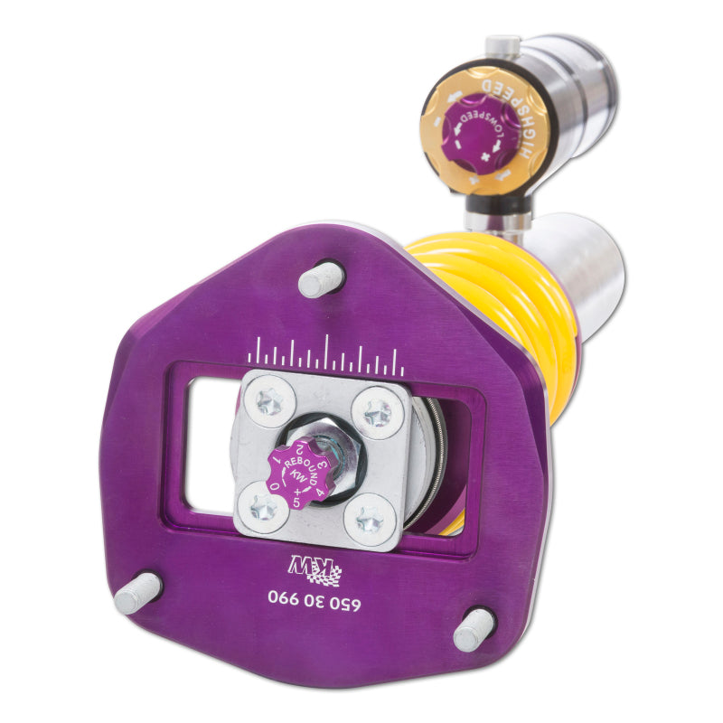 Using the Nordschleife as it's testing grounds and the 7-post rig, KW developed it's V4 Clubsport coilover kit. Wheel loads, vehicle weight and chassis reinforcements (increased body stiffness) can all be taken into consideration with Adjustment -capabilities of the V4 Clubsport. The KW Clubsport coilovers combine KW's high-end racing technology -with maintenance-free KW OEM quality components. Designed to provide you the ideal product to utilize the full potential of your sports car during autocross, track days, high performance drivers education (HPDE) courses, club racing, and is tested rigorously on race tracks such as the Nurburgring Nordschleife. Race teams rely on KW's ra cing expertise and experience for their vehicle setup. This same championship winning pedigree is mirrored in the development of each one of the KW Clubsport coilover systems. Similar to the KW Competition suspension used in international motorsports, the KW V4 Clubsport coilover kit allows fine tuning of the compression damping separately in the low-speed and high-speed range. The click adjustments of the TVCLH-A valve technology -ake for easy Adjustment -directly on the reservoir. You can modify the low-speed compression damping with 6 precise clicks with the purple low speed Adjustment -ial and directly beneath it the golden Adjustment -heel provides an additional 14 precise clicks of high speed compression adjustment. In addition, the TVR-A technology -provides 16 clicks to noticeably adjust the rebound damping independently of the compression damping. If you would like to adjust the KW V4 Clubsport coilover kit it can easily be adjusted for more comfort or to an alternative setup for a new race track. The KW V4 Clubsport benefits from the same motorsports technology -hat has proven its endurance with multiple overall wins at the ADAC Zurich 24h Nurburgring race.