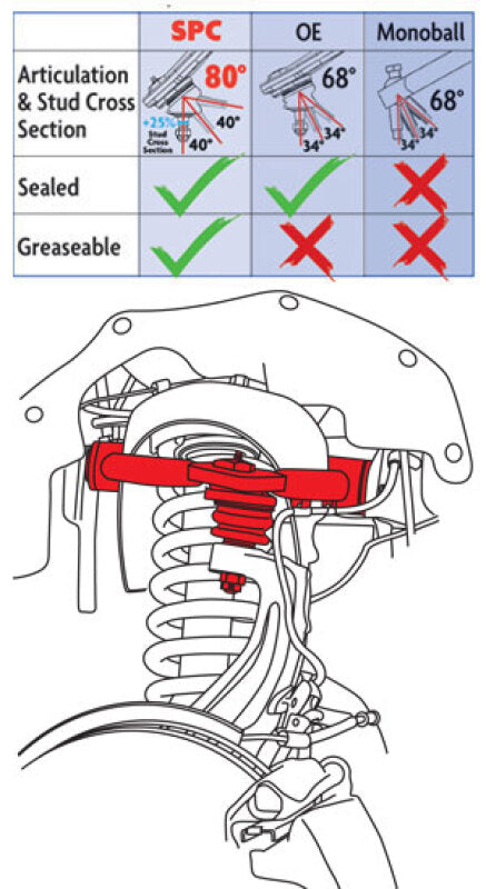Improve droop travel, drivability and tire wear with SPC's adjustable front upper arms for Rangers equipped with steel knuckles. Fit bigger tires without rubbing fenders. Now equipped with maintenance free ball joints and rubber isolated xAxis bushings, this arm is designed to correct alignment angles on standard height vehicles as well as lifted and lowered vehicles while maintaining factory ride quality. SPC's tube and plate arms are made in our facility in Colorado. Their proven design provides the strength and durability needed for the most demanding environments. These remove and replace arms are sold in pairs. Get more droop travel: Don't let OE ball joint or mono-ball articulation limit your travel. SPC joints are oversized and provide 80 of travel. Get your drivability and tracking back: Your truck may have started to 'wander' after you lifted it. That is because you lost caster. Install SPC arms and get your 'drivability' back by putting your alignment back in specification. Improve tire clearance: Are you oversized tires rubbing the fenders or the frame rails? SPC Adjustable Arms, in combination with the OE adjustments on the lower arm, allow you to dial in alignment specs at the same time that you move the tire forward/outward in the wheel well by up to 1". NOTE: For Rangers with steel knuckles ONLY.